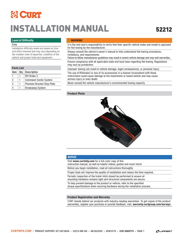 The CURT RVibrake 3 portable flat tow brake system makes towing safer and easier by ensuring your towed vehicle stops securely behind your RV. With its fast 0.5-second response time, the RVibrake 3 reacts almost instantly, giving you better control when braking on steep hills or during sudden stops. This quick response helps reduce stress on your RV’s brakes and keeps your towed vehicle stable. To make things even safer, the RVibrake 3 features brake-lock detection. This smart technology prevents installation mistakes that could cause your towed vehicle's brakes to stay engaged longer than needed, helping to avoid unnecessary wear or damage. Since a flat tow brake system is required in 49 states and throughout Canada, the RVibrake 3 keeps you legal and safe wherever your travels take you. The RVibrake 3 is designed for simplicity. Its one-button interface automatically adjusts itself once placed in your vehicle, and the built-in audio assistant walks you through a fast, 30-second setup. The only installation required is for the breakaway kit, which can be done in just 25-45 minutes. For added convenience, the RVibrake 3 is lightweight, compact, and easy to carry with its built-in handle. The included 7” Command Center tablet and hub provide real-time monitoring, so you can always stay informed about your braking system’s status. Plus, the RVibrake 3 is guaranteed to fit any flat towable vehicle.