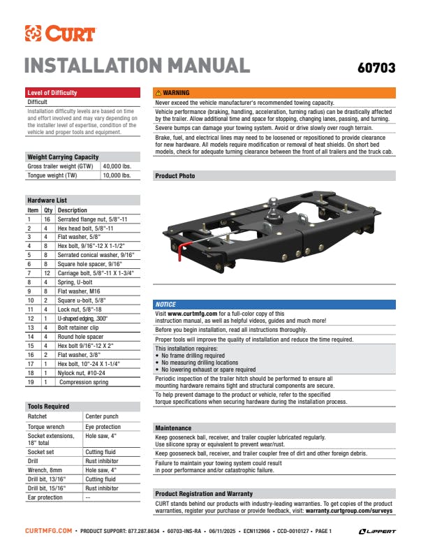 Experience powerful, reliable towing with the CURT PowerHaul™ Double Lock Gooseneck Hitch. Built for both professional haulers and weekend adventurers, this hitch delivers heavy-duty performance, making every towing job safer, smoother, and more controlled. Capable of handling up to 38,000 lbs. GTW and 9,500 lbs. vertical load with the included 2-5/16" ball and up to 40,000 lbs. GTW and 10,000 lbs. vertical load when paired with the optional 3" ball (#60694), the PowerHaul is ready for heavy trailers, construction equipment, and livestock transport. Installation is simple and designed for a single person, requiring no lowering of exhaust or spare tire, no welding, and no bed removal. The center locator system guarantees precise ball placement, so every hitching operation is safe, accurate, and worry-free. Security and convenience are at the forefront of the design. Double locking pins protect both the trailer and the ball, while the removable flip-and-store ball frees up truck bed space for gear, tools, or recreational equipment. The heavy-duty 3/8" handle and spring-loaded 5/8" safety chain loops provide dependable, long-lasting performance on every journey. Built to last, the PowerHaul meets SAE J2638 safety standards, features a rust-resistant liquid A-coat finish, and is proudly designed, welded, and coated in Wisconsin. With a limited lifetime warranty (one year on finish and parts), this double-lock gooseneck hitch gives you the strength and confidence to take on your toughest towing projects, whether you’re hitting the job site, transporting livestock, or cruising the open road with your trailer in tow.