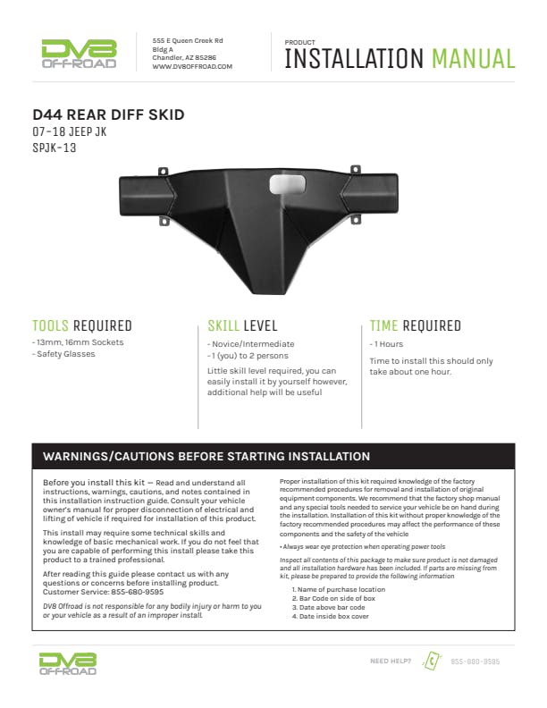 The DV8 Offroad Dana 44 Rear Differential Skid Plate for the Wrangler JK protects the rear diff housing and pinion from rock impacts and helps prevent diff cover leaks on the trail. It uses seven mounting points for a secure fit and includes a paintable aluminum logo plate. Finished in a micro-texture black powder coat and designed for simple bolt-on installation.