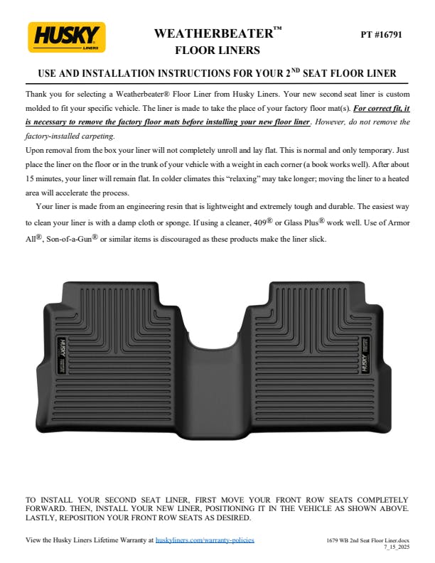 - WeatherBeater(TM) Liners offer protection that extends all the way to your rear seats. So go ahead, lift the seats and leave them up, load after load. Husky's got your floors, and your back, no matter what the road brings your way.