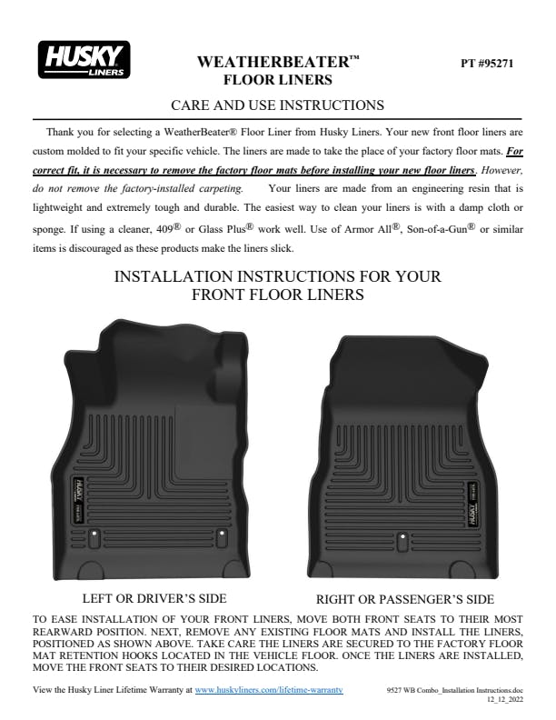 The original all-weather liner is ready, come hell or hot coffee. The Weatherbeater?s construction is a no-slip zone with zero edge curl, and its Stay Put Nibs keep it firmly anchored underfoot. It stands up to chemicals like gas, oil and battery acid, and stays tough and flexible, even under extreme temperatures. Its laser-scanned, FormFit Design? gives your truck, van or SUV an ultra-clean look with easy cleanup to match, while its patented, FormFit Edge? keeps spills contained, carpets unstained. It?s unbeatable Husky protection for life, warrantied the same. Proudly made in the USA.