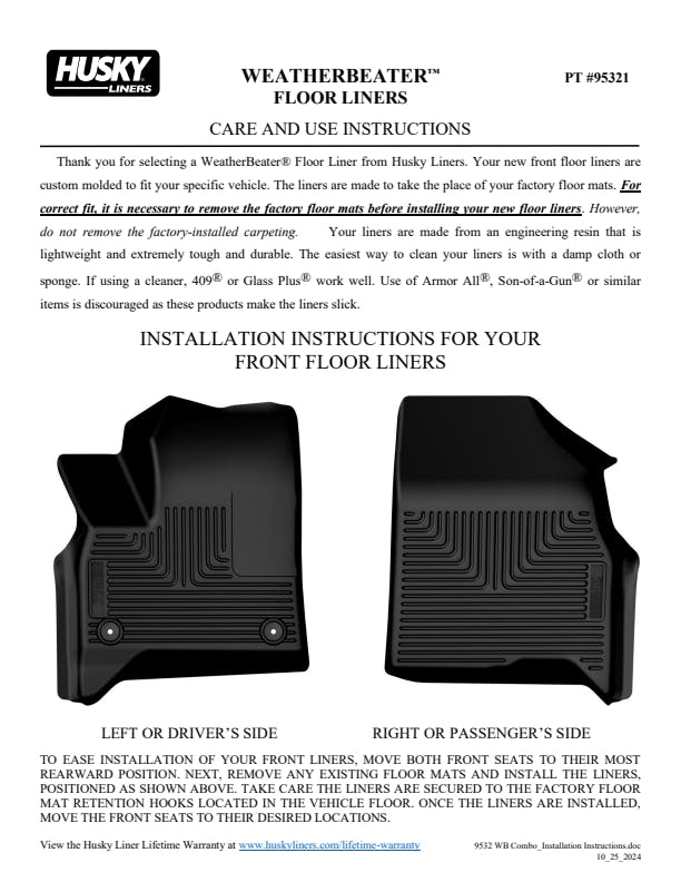 The original all-weather liner is ready, come hell or hot coffee. The Weatherbeater?s construction is a no-slip zone with zero edge curl, and its Stay Put Nibs keep it firmly anchored underfoot. It stands up to chemicals like gas, oil and battery acid, and stays tough and flexible, even under extreme temperatures. Its laser-scanned, FormFit Design? gives your truck, van or SUV an ultra-clean look with easy cleanup to match, while its patented, FormFit Edge? keeps spills contained, carpets unstained. It?s unbeatable Husky protection for life, warrantied the same. Proudly made in the USA.