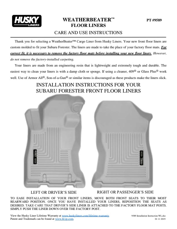 No hassle lifetime guarantee. For details: HuskyLiners.com/ForLife, Our exclusive StayPut Cleats™ help keep your liners securely in place., Our FormFit Design™ process perfectly forms each liner to the detailed contours of your specific ride., Sporty, rugged, and built for a lifetime of non-stop abuse. Put unbeatable all-weather toughness to work on your floor., Made in the USA., When we say it's "guaranteed for life" that is exactly what we mean. No hassles, no guff. If you have a problem with this or any Husky product, we'll replace it., Proudly made in the USA., Easy to install, remove, and clean. Just yank it out, hose it down and carry on., Contains a spill until you can pull it out, wash it off--- good as new!, Our sporty liner material is rugged and can stand up to abuse like no other. |