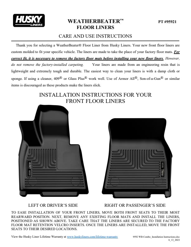 The original all-weather liner is ready, come hell or hot coffee. The Weatherbeater?s construction is a no-slip zone with zero edge curl, and its Stay Put Nibs keep it firmly anchored underfoot. It stands up to chemicals like gas, oil and battery acid, and stays tough and flexible, even under extreme temperatures. Its laser-scanned, FormFit Design? gives your truck, van or SUV an ultra-clean look with easy cleanup to match, while its patented, FormFit Edge? keeps spills contained, carpets unstained. It?s unbeatable Husky protection for life, warrantied the same. Proudly made in the USA.